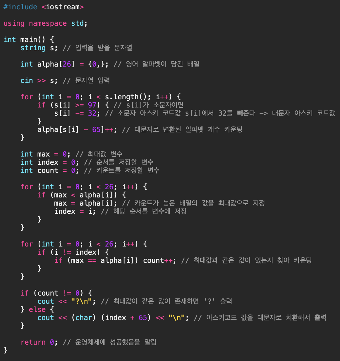 알파벳 대소문자로 된 단어가 주어지면, 이 단어에서 가장 많이 사용된 알파벳이 무엇인지 알아내는 프로그램을 작성하시오. 단, 대문자와 소문자를 구분하지 않는다.
