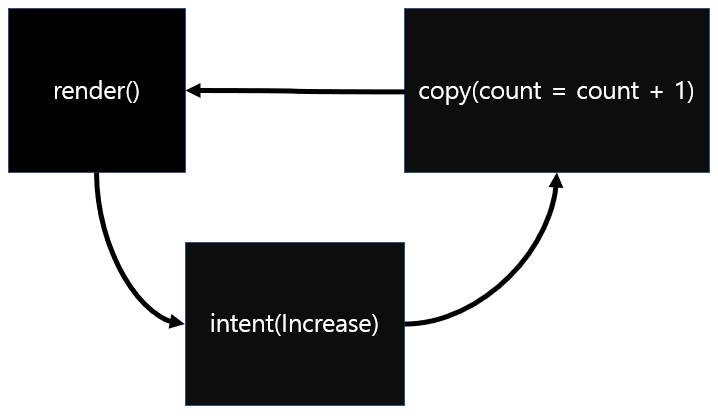 - 위의 예시를 보면 Intent(Increase) 이벤트를 발생시키면 기존 count 값에 + 1을 해 새로운 상태를 생성합니다.