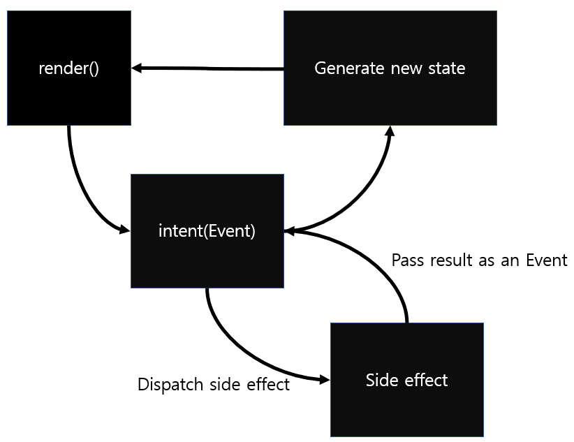 - 그래서 기존 cycle에 Side Effect가 추가되었습니다. Intent()를 사용해 새로운 상태를 생성함과 동시에 부수 효과를 실행(Dispatch)합니다. 실행이 끝났다면 결과를 바로 render() 하는 것이 아니라, Event로써 결과를 전달합니다.