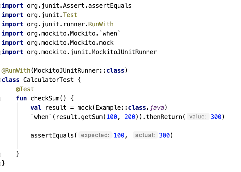 dependencies { testImplementation 'junit:junit:4.12' testImplementation 'org.mockito:mockito-inline:2.28.0' androidTestImplementation 'com.android.support.test:runner:1.0.2' }2번째 라인에 org.mockito:mockito-core를 사용해도 되지만, kotlin에서 에러가 자주 발생함으로 위와 같이 설정해주는 것이 좋습니다.