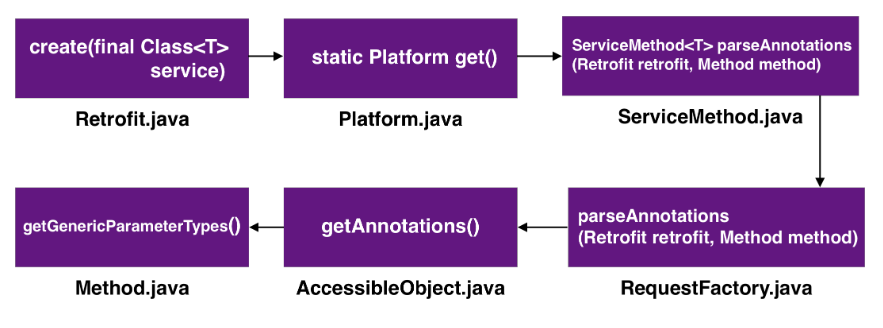 Retrofit은 내부적으로 Dynamic Proxy를 사용하고 런타임에 어노테이션을 파싱 합니다. Interface를 런타임에 읽어서 그 Interface에 선언한 메서드 및 어노테이션 등을 Reflection을 사용해서 처리하여 Proxy Class를 만들어 그 구현체를 사용하는 방식입니다.